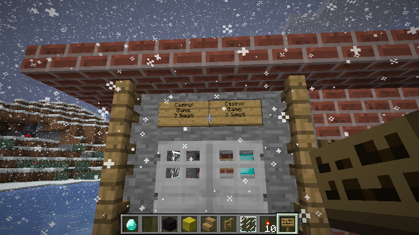Was es geben wird: Im Eingangsbereich kommt man zu einem Restaurante mit BAR (geführt von BeowulfLevain) und einem Wettbüro (geführt von Yonah), wo man über aktuelle Sportereignisse und Events, aber auch über Dispenser wetten kann (beim Dispenser welches item gespuckt wird), und eine Curlingbahn, wo man für wenig Geld mit Freunden eine Runde spielen kann. Dann kann man in eine Halle mit vielen verschiedenen Glücksspielautomaten, und Blackjacktischen (ab 1.3) gelangen. In die Automaten muss man ein Chip (siehe: Wie das laufen wird) in ein Loch werfen, wo sie eine Platte auslöst, und ein Dispenser ein Item spucken lässt. Dann vergleicht man und schon weiss man ob, und was man gewonnen hat. Es wird auch den Klassiker, die Slotmashine geben, wo drei dispenser, drei items spucken, wenn man ein button drückt. Ein Live Angestellter wird bei einem Gewinn den Gewinn auszahlen. Dies waren nur einige Beispiele, es sind noch weiter dinge geplant (z. B. Poker, Roulette etc.) Selbstverständlich wird es nicht immer eine Live Bedienung geben deshalb wird es ein Selbstbedien-Buffet geben (also mit Shopschildern). was noch möglich wäre wäre die Vermietung von kleinen bereichen für kleine shops