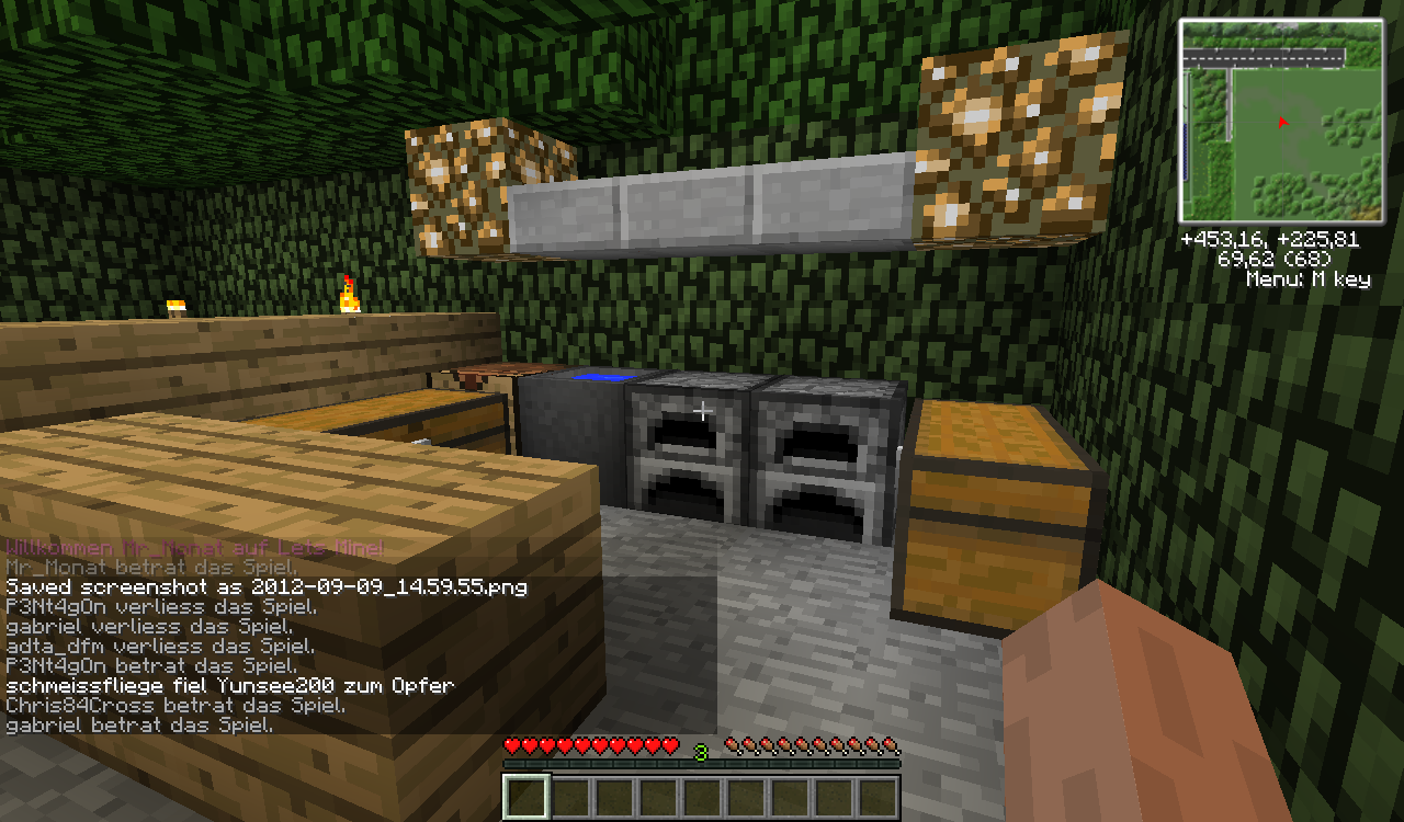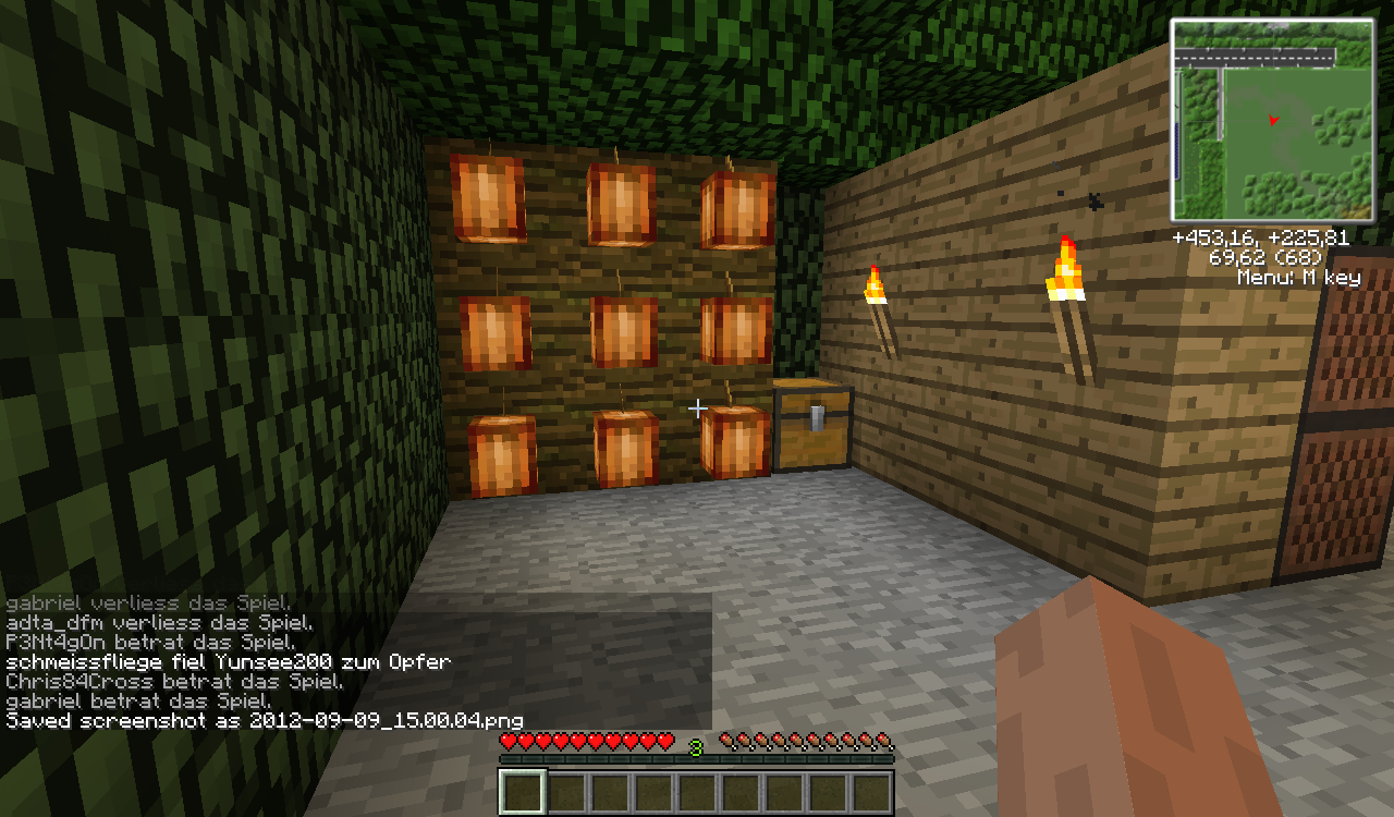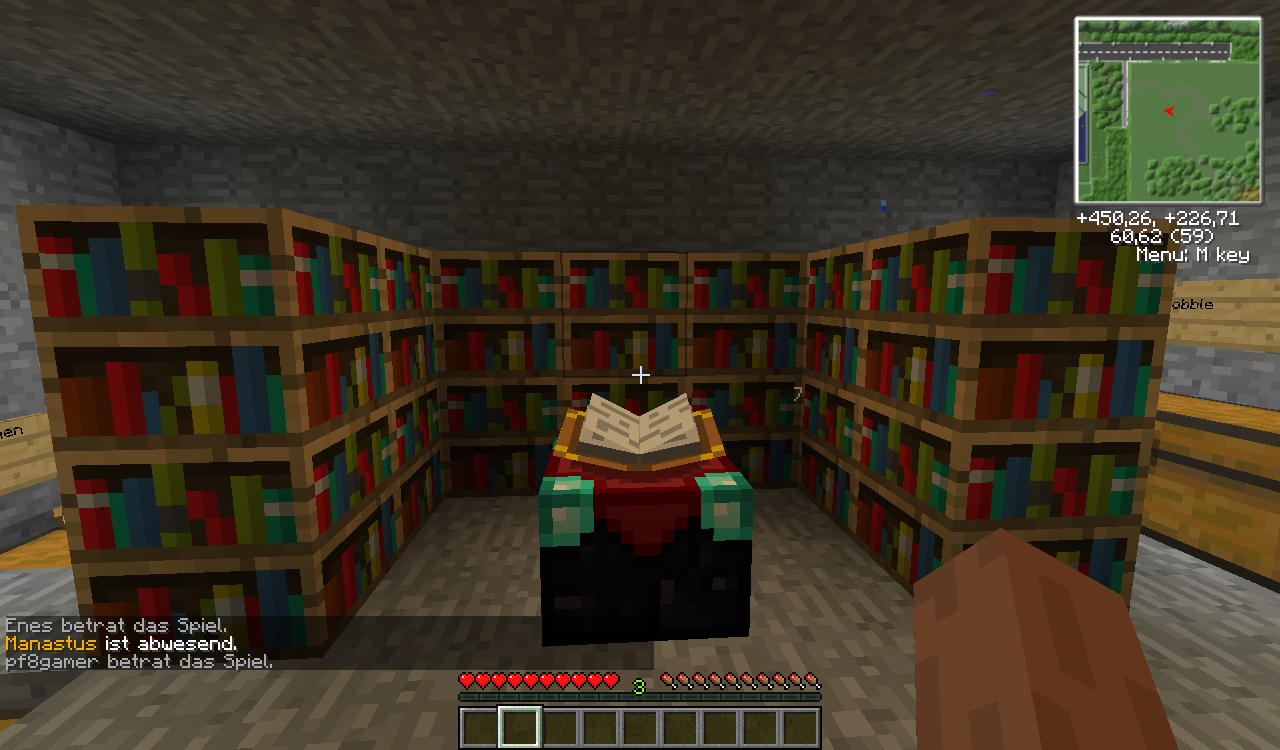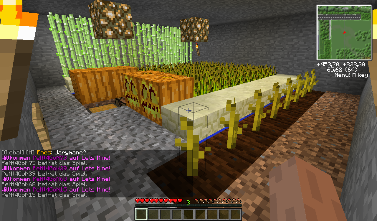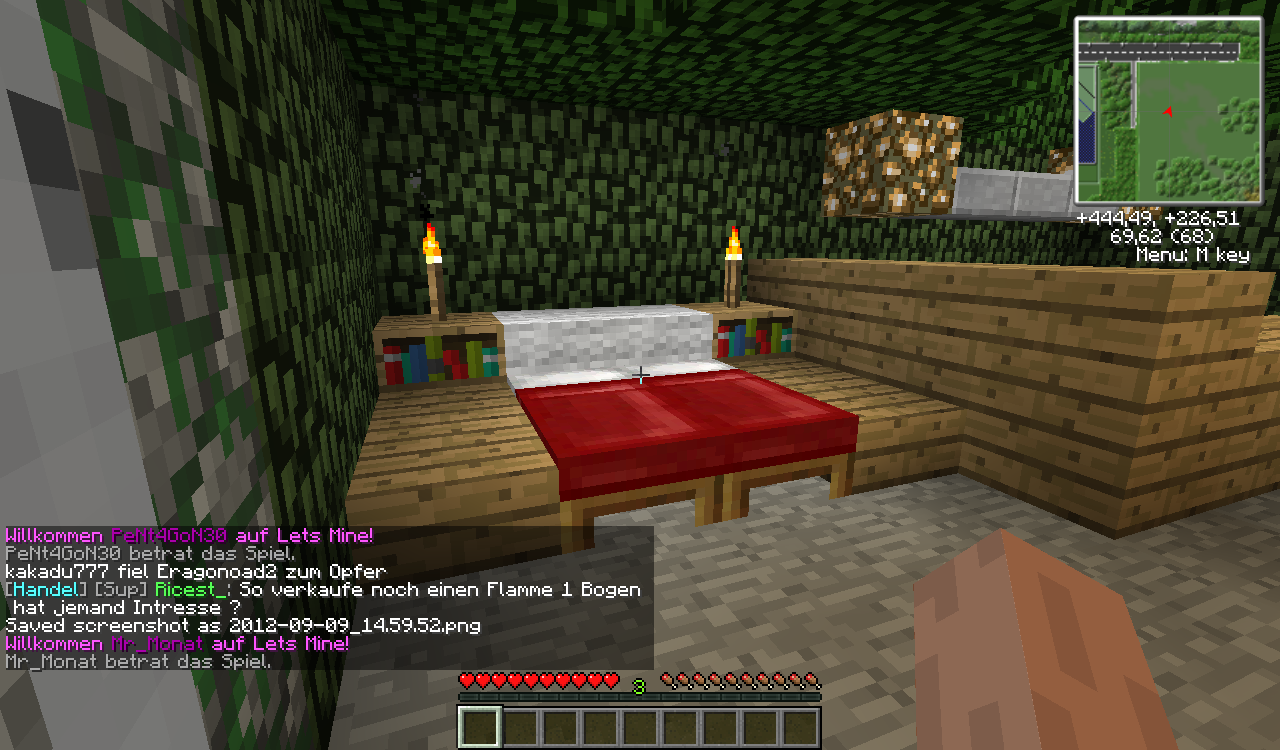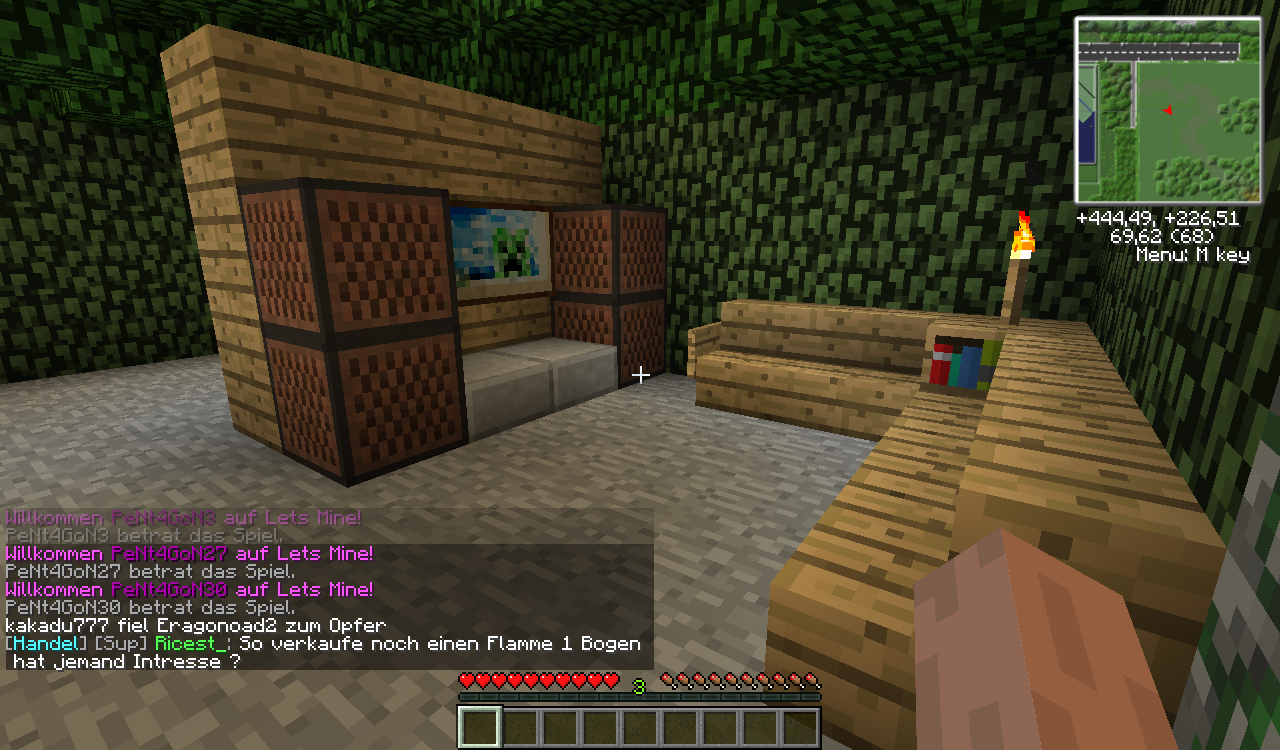 Es gibt eine Küche, Eine Fernsehecke, ein Doppelbett, eine Farm [mit Melonen, Kürbissen, Zuckerrohr, Kakaobohnen und Weizen], einen Zaubertisch und Endertruhe.