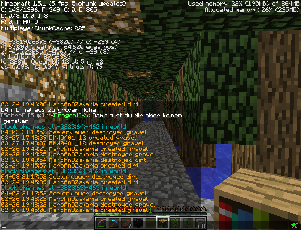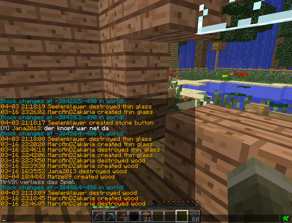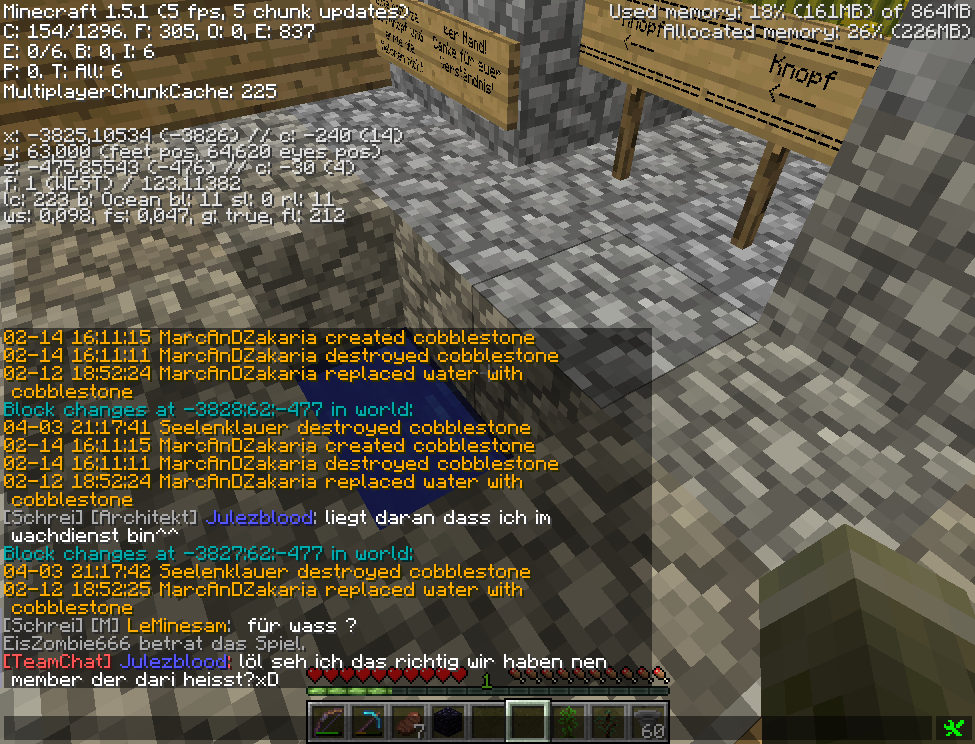 4. April 2013 #3 lmrl.eu hat bei Jana2013 gegrieft.Gestohlene Blöcke:3x thin glass2x wood1x wood fence1x stone button gesetztGesamtzahl: 7Strafe 30 min Jail und 2800 GeldstrafeStrafe offenPE 543