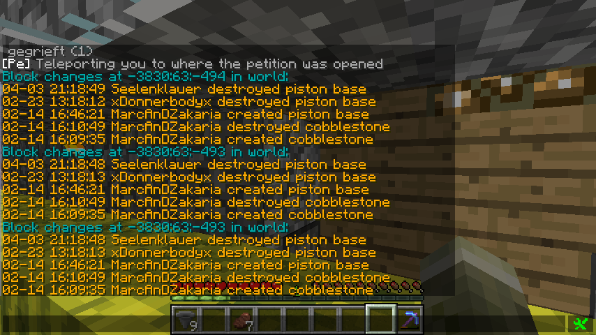 4. April 2013 #4 lmrl.eu hat bei MarcAnDZakaria gegrieft.gestohlene Blöcke:3x redstonewire2x leaves3x dirt4x gravel12x cobblestone3x wood2x ironblock (x9)2x piston baseGesamtzahl 47Strafe: 120 min Jail und 18800 GeldstrafePE 545[Strafe offen}