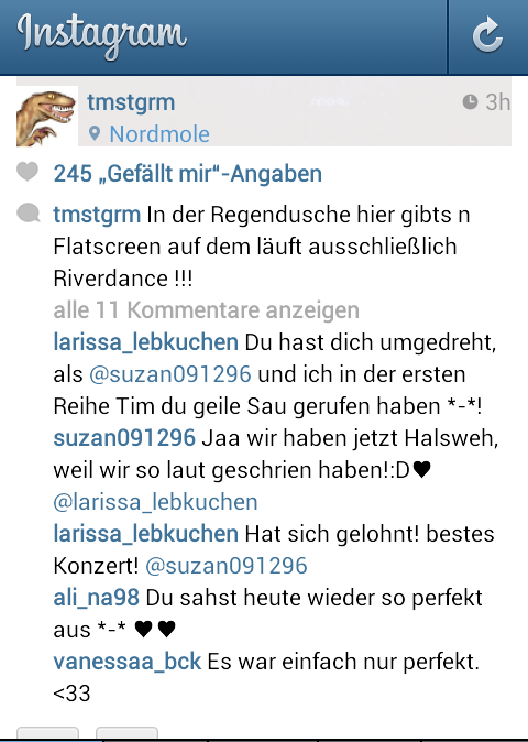 "OOUUUH YEEAAH wir haben deinen Namen auf unsere suuuperkleinen BH's geschrieben wenn wir überhaupt schon welche tragen können und deinen Namen gebrüllt"-Peinlichkeits-Kinder unter dem Instagram Account von Tim. (Cro's Gitarrist) FAAANGIIIRLS von heute. Is ja ekelig..
