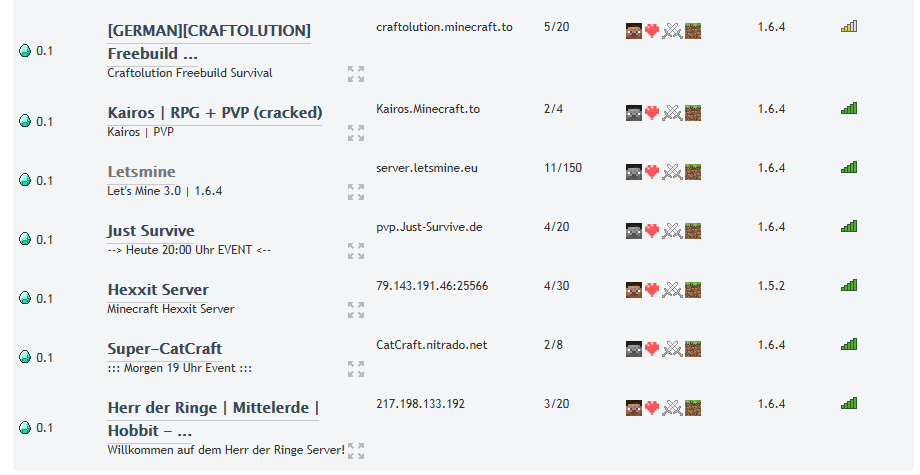 Um in Zukunft neue Spieler für LetsMine zu begeistern, halte ich es für sinnvoll auch mal den ein oder anderen Youtuber wegen einem LetsPlay anzuschreiben. Damit meine ich nicht LetsPlay- Giganten wie Gronkh oder Sarazar sondern Youtuber, die ohne hin schon Server vorstellen, auf uns aufmerksam zu machen. Weiters könnte man sich ja mal auf serverliste.me engagieren. K.A. ob ihr da vielleicht schon seit(gibt keine Suchfunktion 8|). Falls bereits angemeldet dann zum Voting auf dieser Homepage dazustellen.