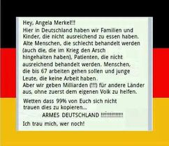 Miner_Zocker, zum einen, haben solche Fotos schon was wahres dran. Aber, was soll bitte unsere Bundeskanzlerin Merkel tun. Ich finde es echt blöd, wenn immer diese ganze Schuld auf eine Person geschoben wird. Klar, viele Menschen gehen bis 67 arbeiten, viele aber auch nicht. Es gibt viele Leute die versuchen einen Beruf zu bekommen, viele aber auch nicht.