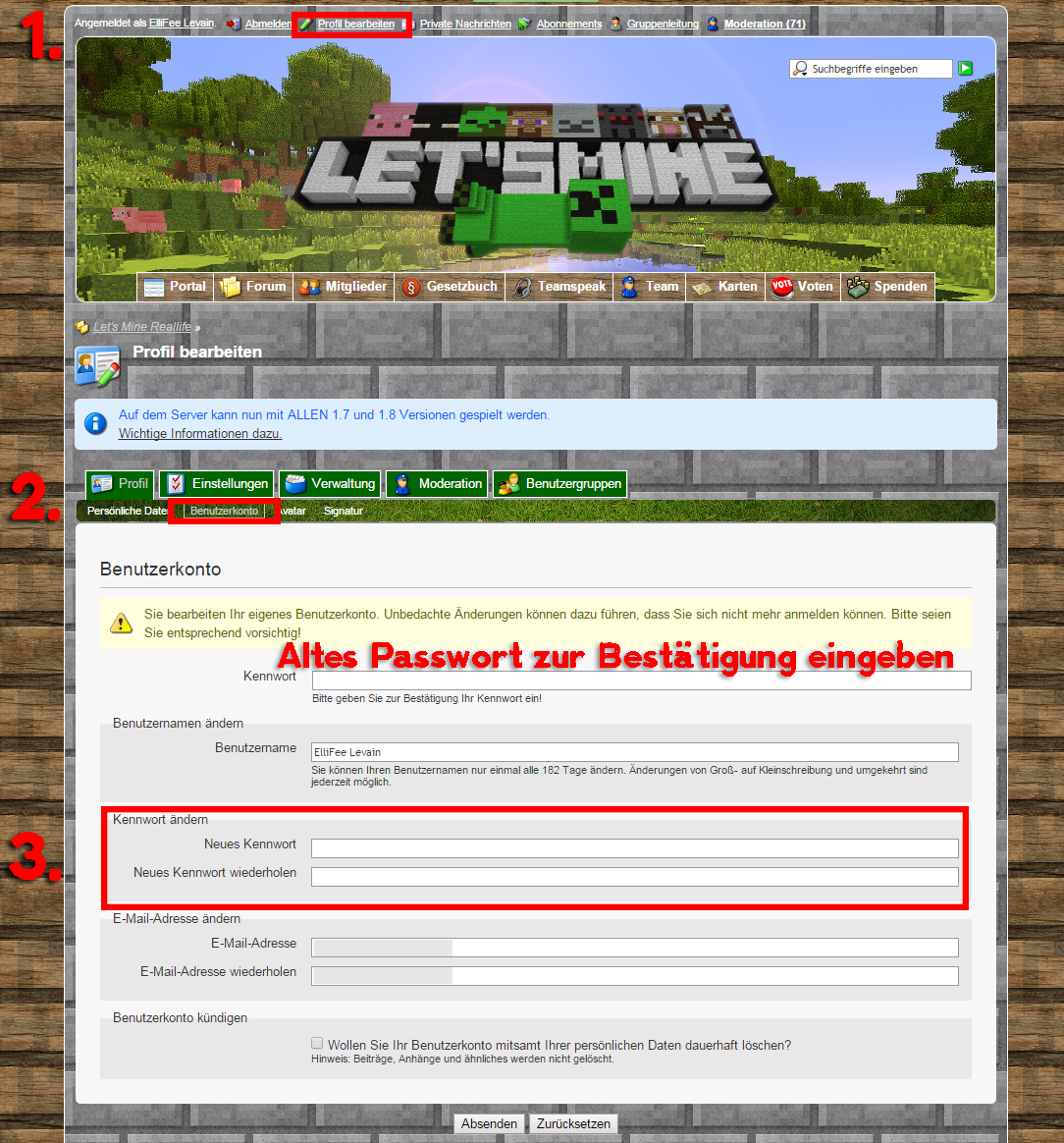 - Im Forum geht ihr unter “Profil bearbeiten” auf “Benutzerkonto” und könnt dort Name, Passwort und sogar Email-Adresse ändern.