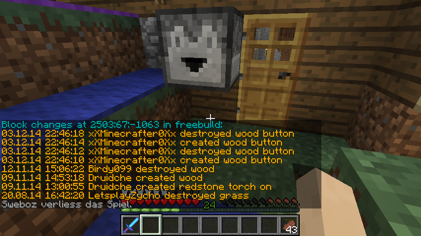 xXMinecrafter0Xx hat bei Druidche gegrieft! Gestohlene Gegenstände: 8x Wood Button Gesamtzahl der Blöcke: 8 Strafe: 30 Min jail 3200 Mark PE-Nummer: 6097 [Strafe offen] bereits gebannt