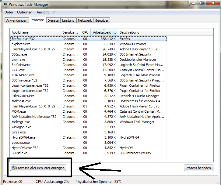 Im Anhang Bild 1 zeigt dir erst mal wie du alle Prozesse siehst^^ Das nötig damit du auch die Prozesse des Systems siehst^^
