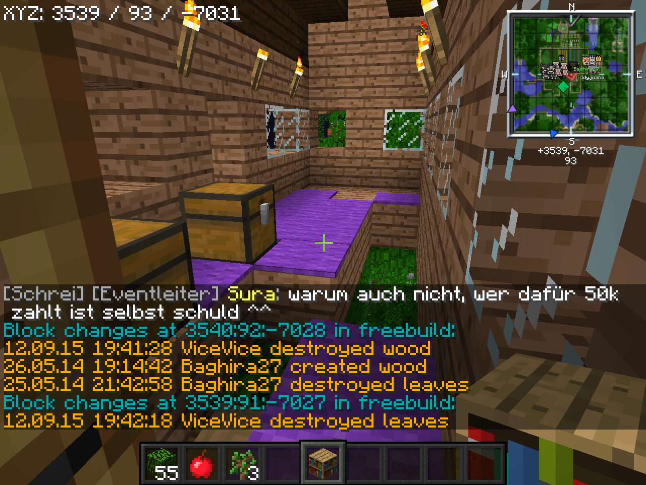 [Akte] ViceVice ViceVice hat bei Idyjuana gegrieft! Gestohlene Gegenstände: 10xLaub 1xTreppe 4xglass 11xHolzbretter 1xBett 2xKiste 8xTeppich 3xHolz Gesamtzahl der Blöcke: 40 Strafe: Permabann da Neuling + Rollback Done by Taiga PE-Nummer:10044 [Strafe offen]