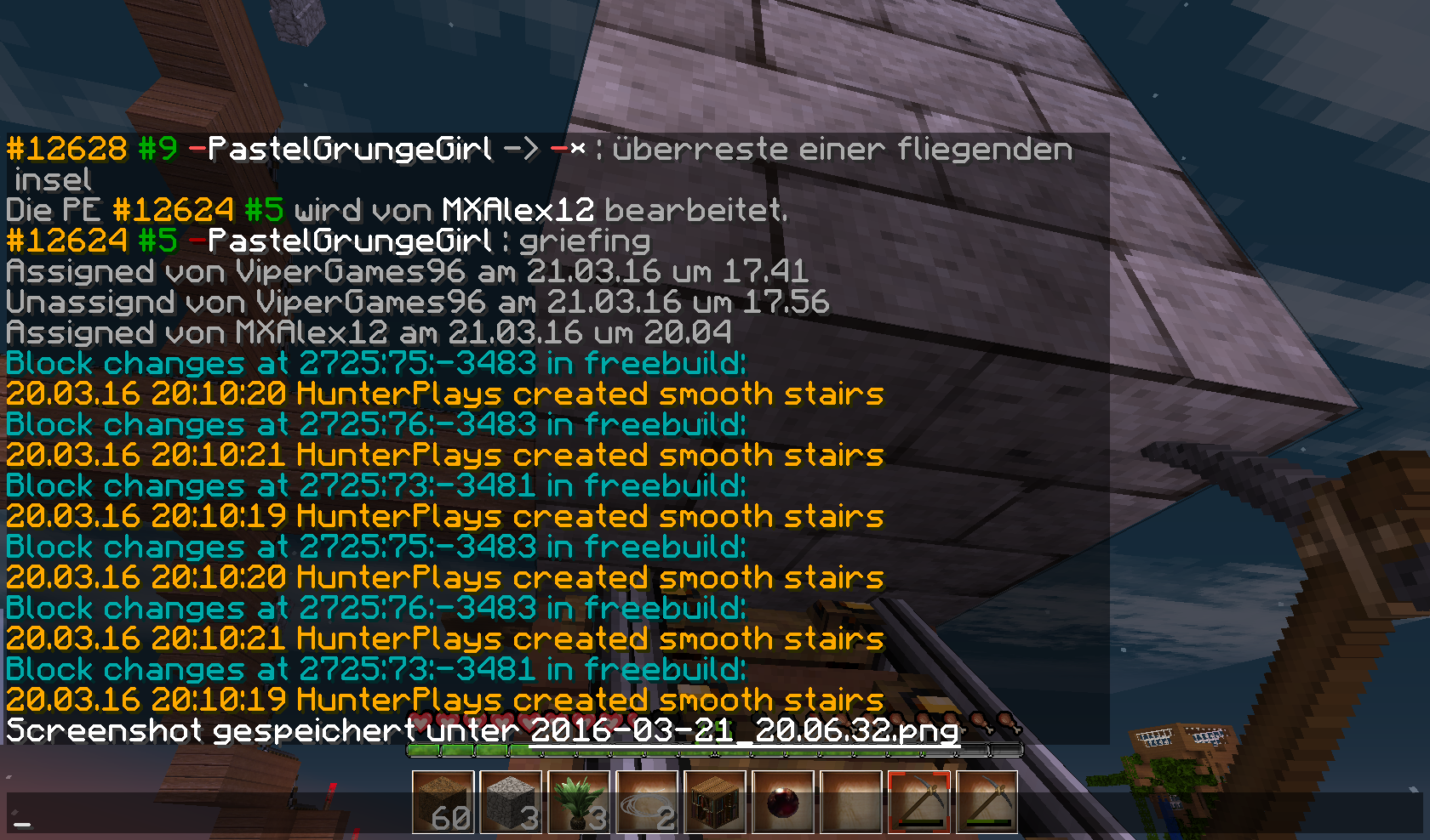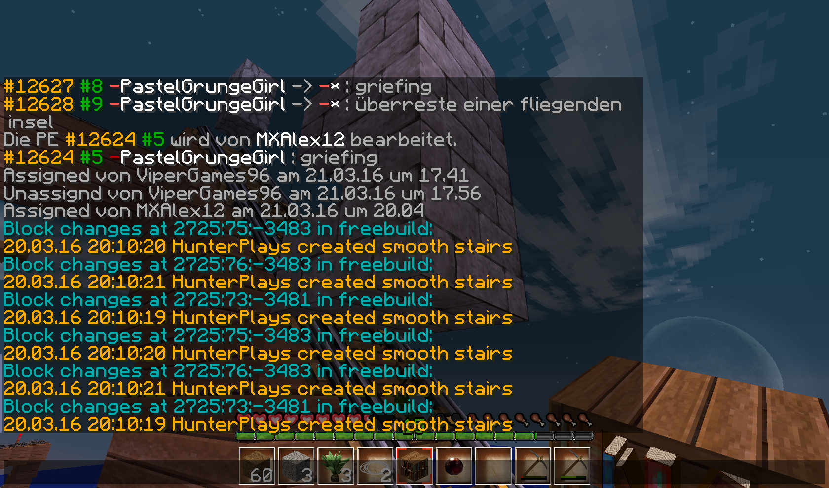 [Akte]HunterPlays HunterPlays hat bei PastelGrungeGirl gegrieft! Gesetzte Gegenstände: 70 Nach Rollback Gesamtzahl der Blöcke: 70 Strafe: 1 Woche-1 Monat Tempbann Rollback Done bei Taiga -Nummer:12624-12627 [Strafe offen] Done by Taiga