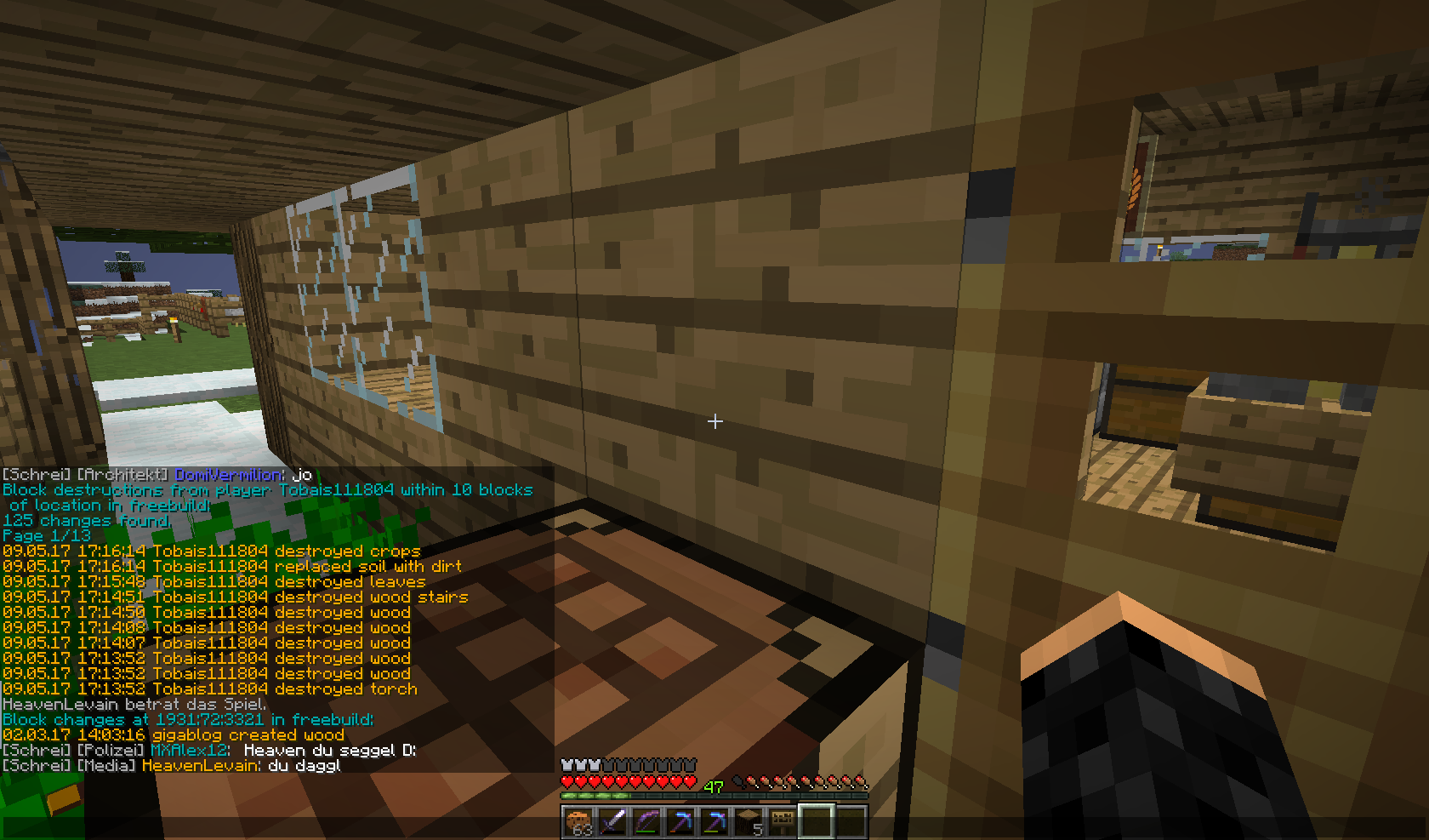 [Akte]Tobais111804 Tobais111804 hat bei gigablock gegrieft! Blöcke 1x Woodstairs 5x Wood 1x Torch 1x Dirt gesetzt Gesamt 8 Blöcke Strafe 15 Min Jail und 3200 Mark [Strafe offen] Done by xTimKeks ( 15 Min Offline-Jail )