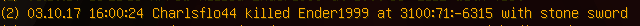 Charlsflo44 hat Ender1999 getötet! Strafpunkte: 10 Strafe: 15 Minuten Jail 4000 Mark Anzeige: Anzeige gegen Charlsflo44 wegen Mord [URL:http://www.letsmine.eu/forum/thread/46101-anzeige-gegen-charlsflo44-wegen-mord/?postID=262421#post262421] [Strafe offen]