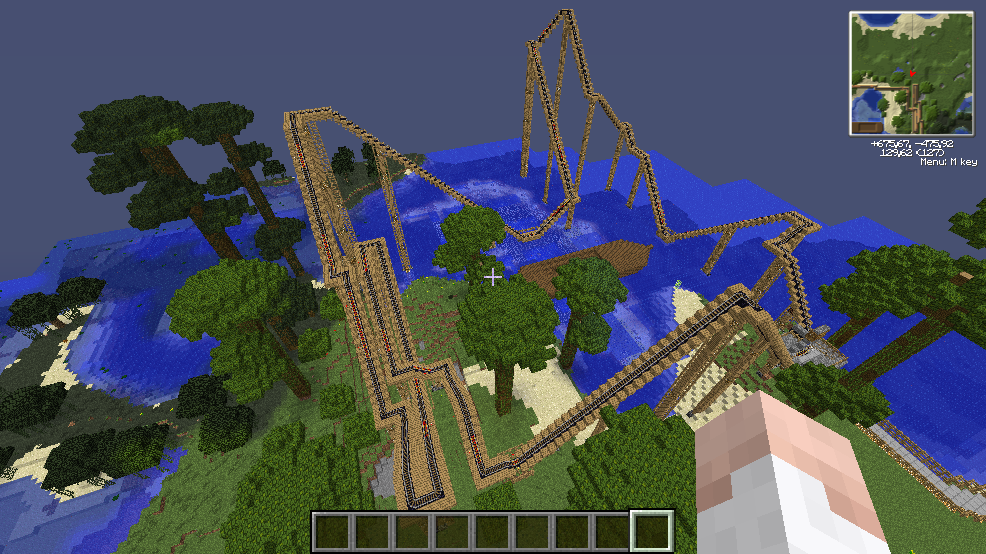 Was ich verbessern würde: Es scheint so, als wären die Airtime-Hills höher als der Lift selber. Das heißt, im echtem Leben würde der Wagen die Bahn gar nicht schaffen. Wenn es dann wie in Minecraft mit solchen Boostern ist, bzw. mit einem 2. Lift wäre es im echten Leben auch sehr langweilig, wenn man über jedem Hügel nur sehr langsam fährt.
