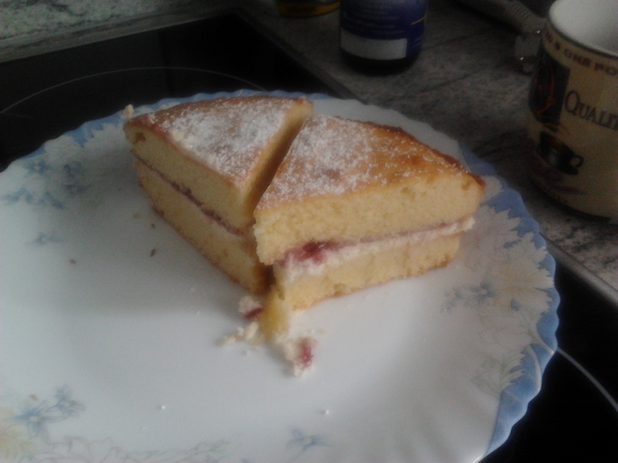 7. Auf den Böden der beiden Kuchen (Also die Seite die in der Form unten und nach dem Stürtzen oben war) kommt nun die Sahne und die Marmelade drauf, also einer auf dem die Sahne ist und einer auf dem die Marmelade ist. Danach beide Hälften zusammen führen (Marmeladehälfte sollte oben sein). Puderzucker drauf streuen und Himbeeren zur Verzierung. Am Besten kühl lagern, also im Kühlschrank, sonst zerläuft euch die Sahne.