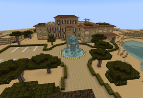 Ich biete hier meine Sandsteinvilla zum verkauf an. sie befindet sich im Freebuild in Goldrush City. Der Vorhof ist mit Eichenlauf gesäumt und setzt den mit Glowstone umrandeten Brunnen wundervoll in Szene. Passend zum Wüsten-Thema findet man auch einige Palmen rund um das Gebäude. Vor der Villa gibt es Platz für bis zu 6 Pferde.