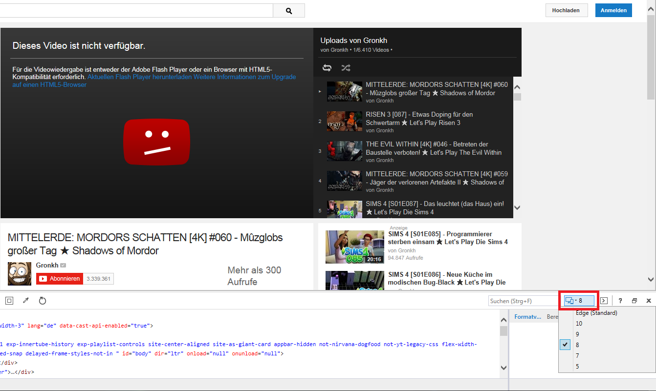 Du kannst dem IE allerdings anweisen einen anderen Browser zu emulieren, der nicht HTML5-fähig ist, beispielsweise den IE8. Lade dazu die Website (YouTube) und drücke F12 für die Entwickleroptionen. Unten rechts ist nun ein Feld in dem du den Dokumentmodus von Edge auf 8 stellen kannst.
