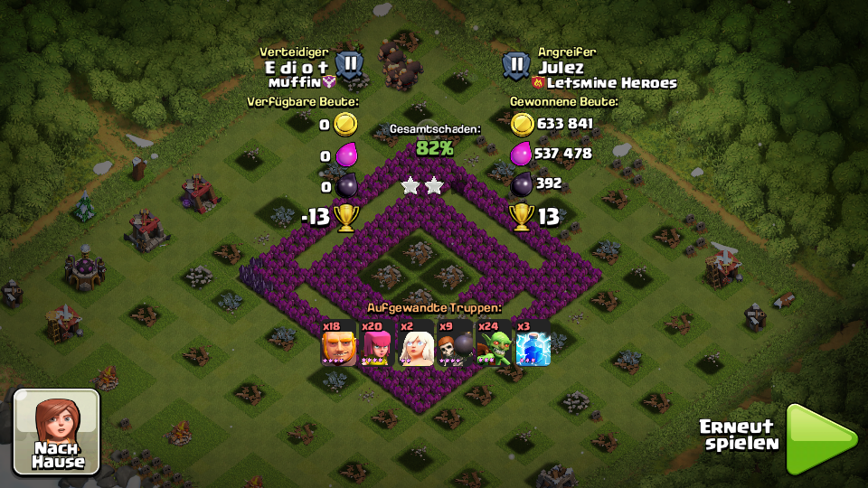 Bevor man angreifen kann, hat man 1 Tag die Möglichkeit, seine Gegner auszuspionieren. Schaut daher, welchen Gegner ihr komplett schlagen könnt, um möglichst alle 3 Sterne zu holen. Übernehmt euch besser nicht, greift lieber wenn ihr nicht sicher seid einen schlechteren Gegner an. Es wäre von Vorteil, wenn wir uns ingame absprechen, welchen Gegner ihr angreifen wollt, damit auch jeder den Gegner angreift, wo er 3 Sterne holen kann.