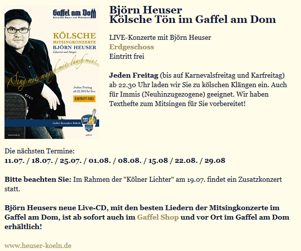 Jeden Freitag Abend findet dort ab ca. 22:30 ein kleines Mitsingkonzert statt. Die Stimmung ist dann in dem recht großen, rappelvollen Brauhaus, das sich auf zwei Etagen verteilt, einfach nur genial. Die Leute kommen von überall her und singen die meißt auf kölsch gesungenen Texte mit, teilweise ohne sie zu verstehen. Keine Sorge, Liedtexte werden rausgegeben.