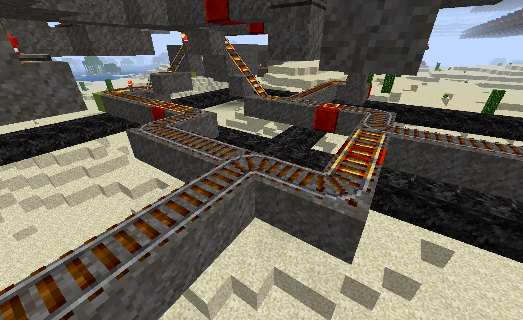 Die Kreuzung ist modular aufgebaut, es können also auch mehr oder weniger Ein-/Ausfahrt-Paare eingebaut werden. Es gibt (hier) 4 Punkte, an denen ausgestiegen werden kann. Will man weiterfahren, kann man per Hebel auswählen, ob man die aktuelle Ausfahrt nehmen oder zur nächsten Ausfahrt wechseln möchte. Zum Glück spielt Minecraft hier mit und die Hebelstellungen sind immer gleich: links die aktuelle Ausfahrt, rechts die nächste Option. Die Knöpfe zur Weiterfahrt befinden sich direkt an der Wand hinter dem Minecart, dies kann aber noch geändert werden.