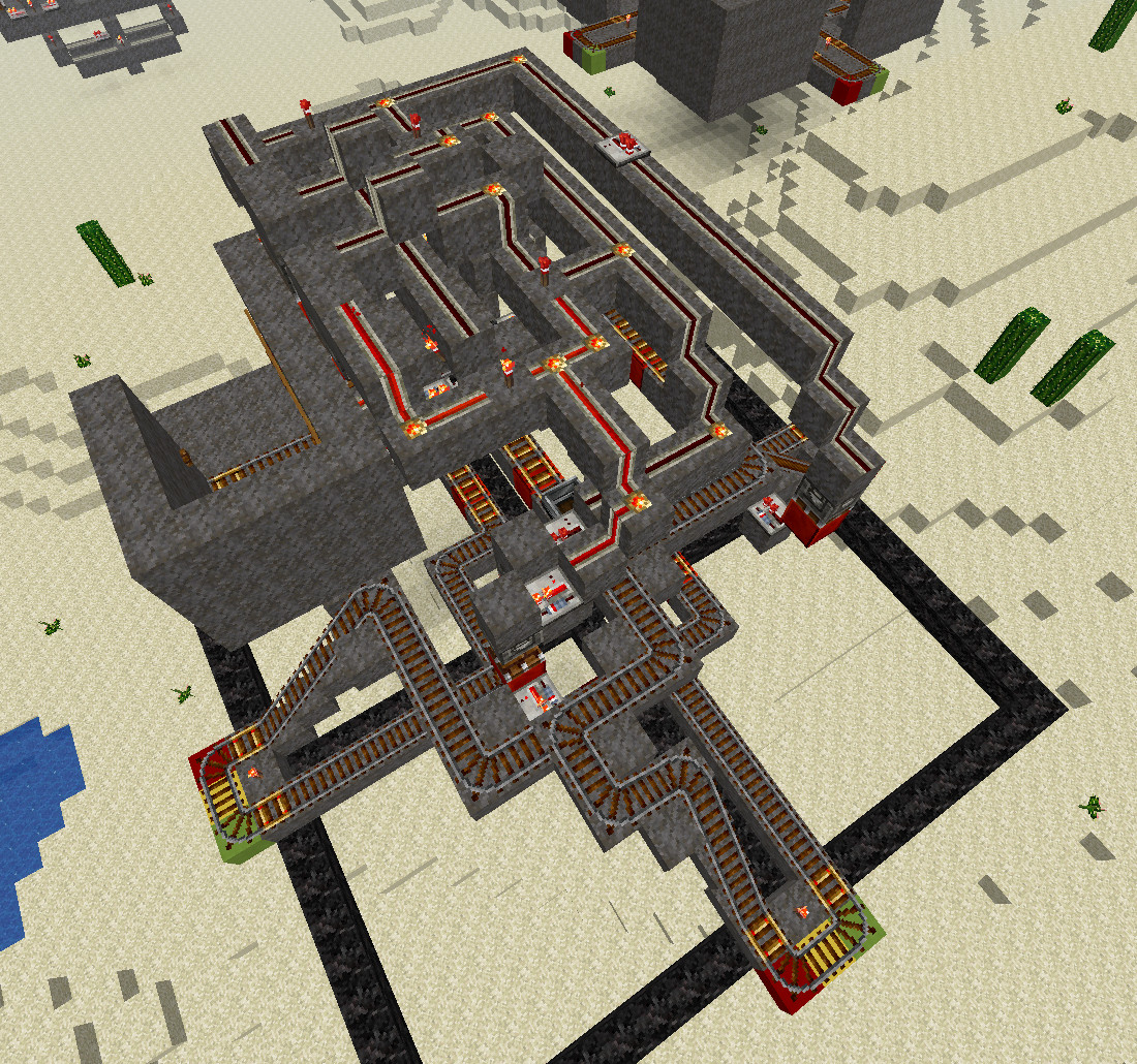 Der mittlere Bereich wird nicht benutzt und sollte wegen der Gleise auch nicht betreten werden. Es bietet sich an, dort zur Station passende Dekoration zu platzieren, wie etwa ein Diorama des dortigen Bioms.Draufsicht, komplett
