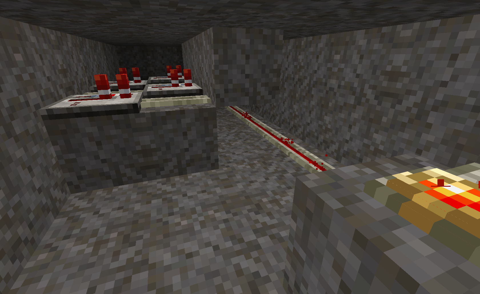 Zum Redstone: Die Verkabelung ist trivial und kann, wenn der Bedrock richtig verteilt ist auch noch eine Ebene tiefer angelegt werden, sodass eine extra Abdeckung nicht mehr nötig ist. Die Verzögerung zwischen Druckplatte und Haltepunkt sollte noch erhöht werden.