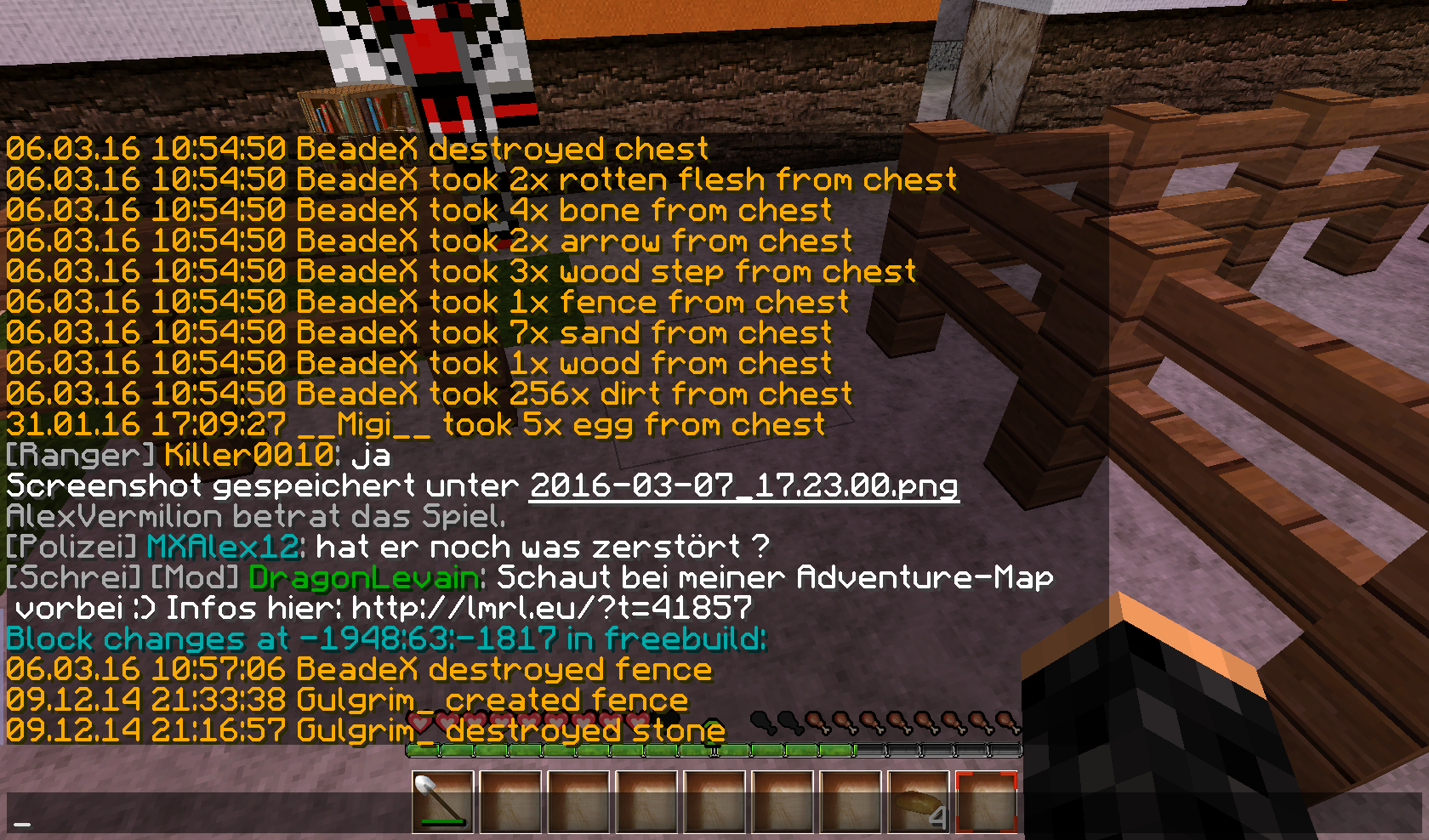 [Akte]BeadeX[BANNED] MXAlex12 8. März 2016 [Akte]BeadeXBeadeXhat bei Killer0010 gegrieft!Gesetzte Gegenstände:58x DirtGesamtzahl der Blöcke: 58 Rollback schon durchPermabannPE-Nummer:12450[Strafe offen]