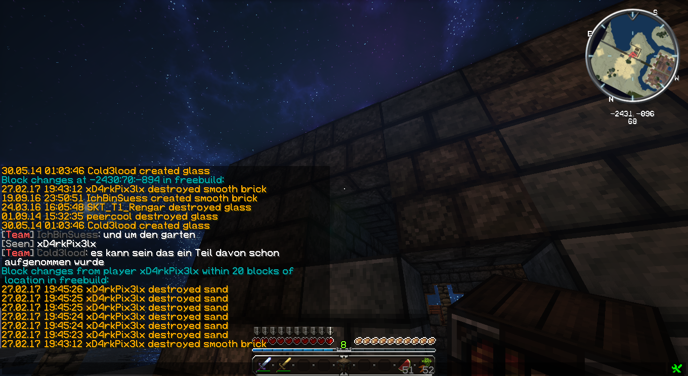 [Akte] xD4rkPix3lx _Nightcat_ 1. Juni 2017 xD4rkPix3lx hat bei IchBinSuess und Cold3lood gegrieftGestohlene Gegenstände1x Steinziegel (Smooth)6x SandStrafpunkte: 7Strafe: 14 Minuten Offlinejail[Strafe Offen]Aufgrund fehlender Userdaten vorerst geklärt.