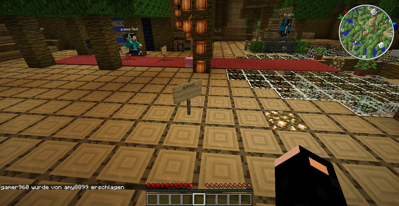 Ein Schild das ich am Spawn gewidmet bekommen habe, nachdem ich mit einem vollen Inventar in Lava fiel.