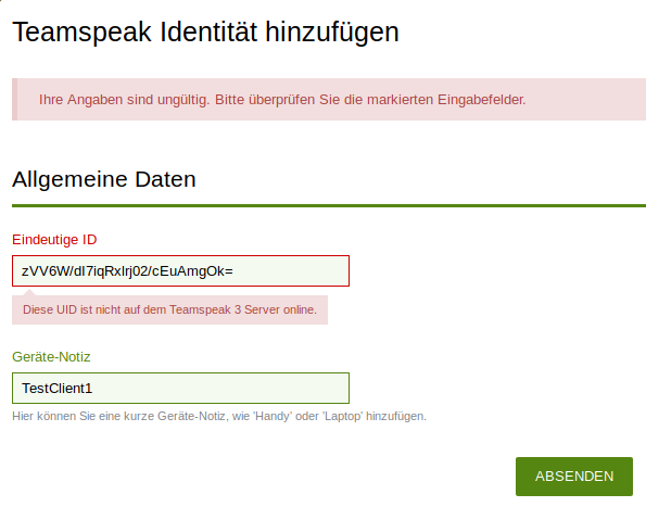 Achtet darauf, dass ihr die Eindeutige ID eures Account von Teamspeak nutzt, mit welchem ihr auch gerade online seid.
